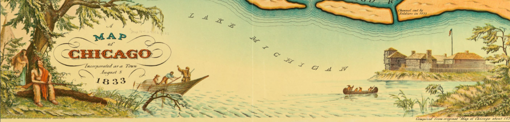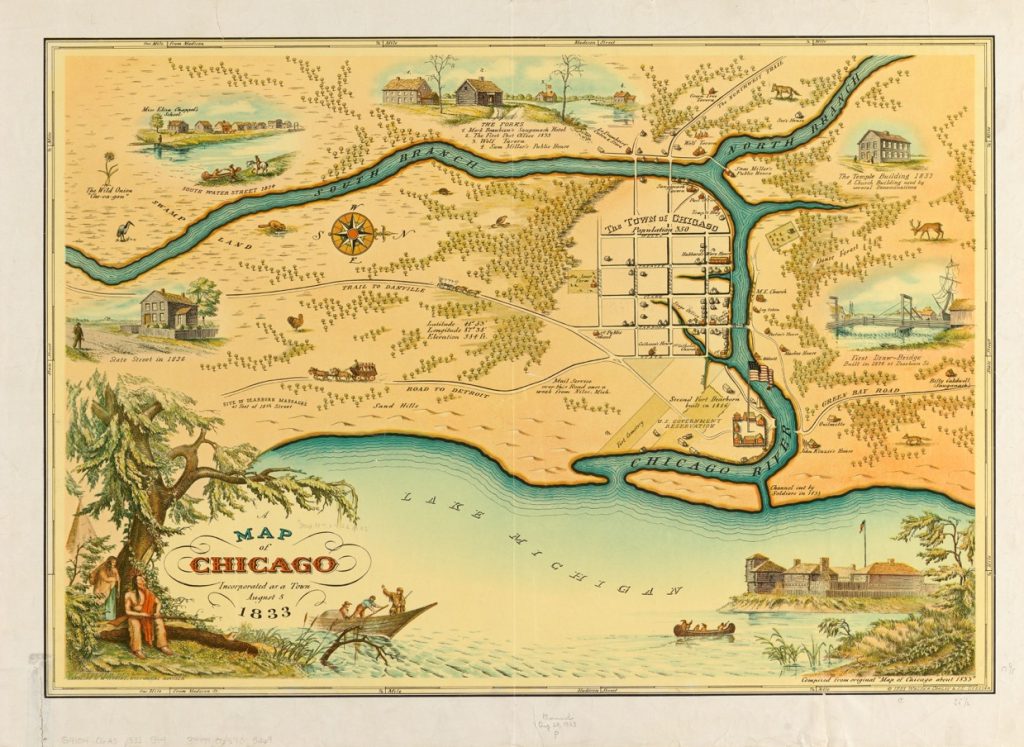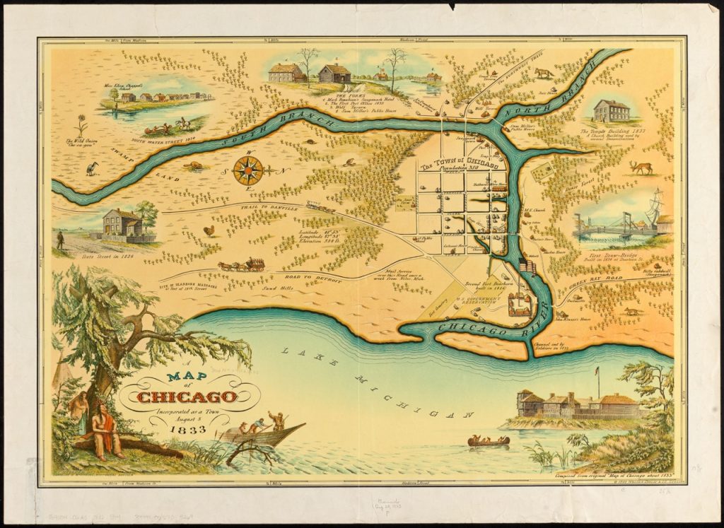 - The 1933 image is based on an 1833 map and commemorates the formal incorporation of Chicago as a settler city. Chicago was incorporated in the same year as the 1833 Treaty of Chicago, which led to a mass forced removal of Indigenous people from the Chicago region. Where do you see Indigenous people in the image? How does this decorative map represent Indigenous presence relative to the physical location of Chicago?