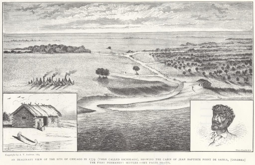 The image below appears in Alfred T. Andreas’s History of Chicago, a three volume history published in 1884, which many people who study the history of Chicago still use today. Andreas was an American historian. He was most famous for his atlases of counties and states across the Midwest. This drawing from the History of Chicago imagines what Chicago looked like in 1779. It shows an open landscape with a small group of ten teepees or lodges with three Indigenous people in them. This imagined portrait of Jean Baptiste du Sable (no image of him actually exists) includes a drawing of his home. While there is some scholarly debate about du Sable’s identity, most scholars think he was a Black man of Haitian descent married to a Potawatomi woman.