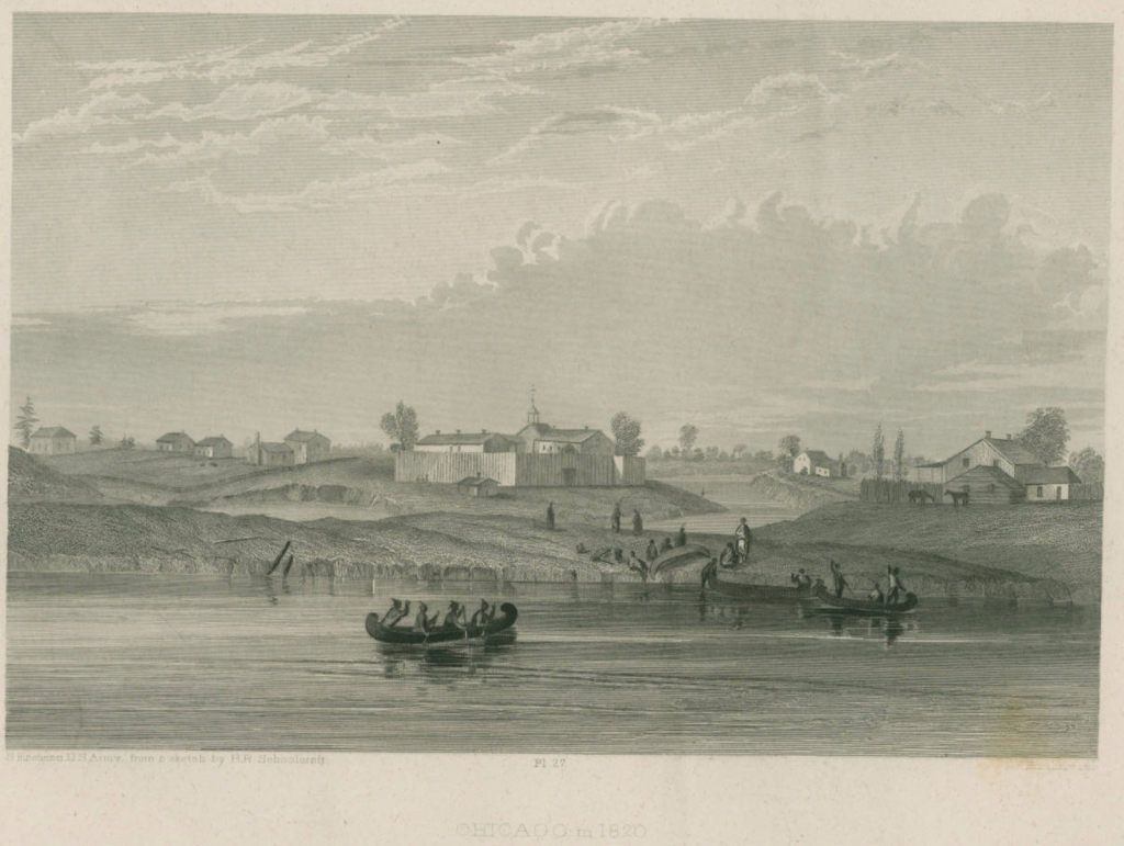 Source citation: Eastman, Seth. “Chicago in 1820.” in Schoolcraft, Henry Rowe, Historical and statistical information respecting the history…of the Indian tribes of the United States. (Philadelphia: Lippincott & Grambo & Co, 1854).