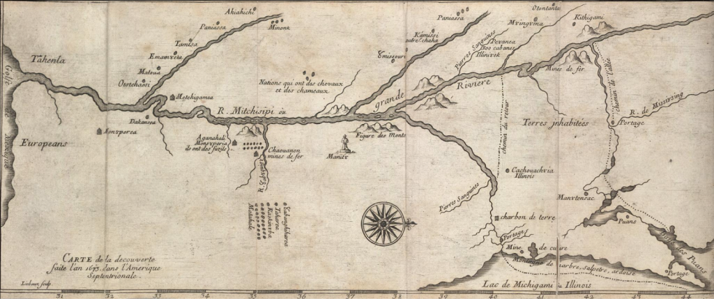 6. Now we’re going to look at a source that shows us European perspectives on land. Re-read the Background section on maps. Then, take a look at Source 3, the Carte de la découverte faite l’an 1673 dans l’Amérique septentrionale, also known as “the Marquette Map.”