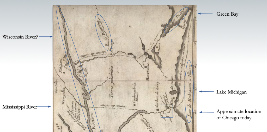 Jacques Marquette was a Jesuit missionary who traveled through the Mississippi River Valley in the late 1600s. He was born in France in 1637 and arrived in Quebec in 1666. Marquette spent time with many Indigenous communities north of the St. Lawrence River and studied several Indigenous languages. In 1673, Marquette left St. Ignace (a French settlement in what is now known as Michigan) with Louis Jolliet, a French explorer. Together, they traveled through present-day Wisconsin to the Mississippi River. Once on the river, they traveled hundreds of miles south to what is now called the Arkansas River. However, on their return journey, Native people told them about a shortcut through the Chicago portage. Even though Kaskaskia people guided Marquette and his group through the portage, he and Jolliet are frequently credited for “discovering” Chicago.