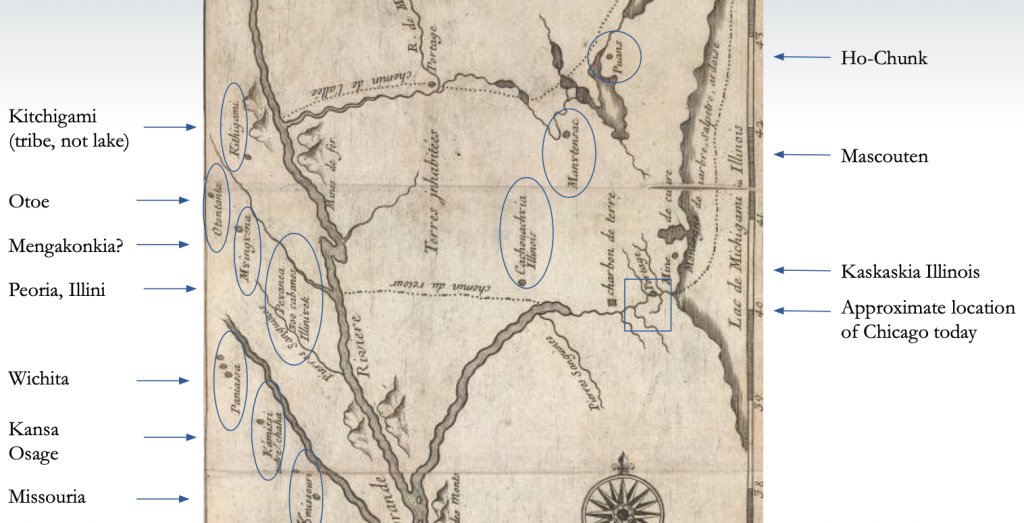 8. Now, look at the map again. Note the locations of the many Native nations whose village sites are listed on the map. These include the Kitchigami, Otoe, Mengakonkia, Peoria, Iillini, Wichita, Kansa, Osage, Missouria, Ho-Chunk, Mascouten, and Kaskaskia.