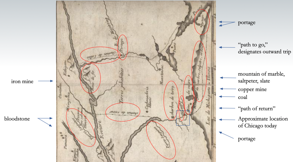 Colonial powers also used early maps to identify natural resources that could be taken for various reasons. It was common for early French maps to chart copper, saltpeter, and iron mines, among other natural resources. This could help them tell people with power back in Europe about an area’s potential for exploitation. The 1673 map from the Marquette expedition shows various natural resources. This map circulated widely and was meant to inspire support for future colonial endeavors. Once they saw these resources, Europeans used maps to “claim” specific areas in their name, even though Native people were already living there.