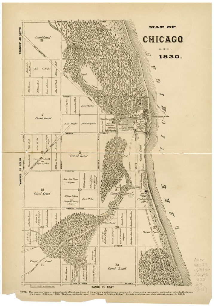Source citation: Andreas, Alfred T. “Map of Chicago, 1830” in History of Chicago: From the Earliest Period to the Present Time. Vol. 1 (Chicago: A.T. Andreas, 1884), 112-113.