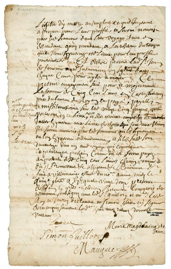 Source citation: Marie Magdelaine de Saint Jean, Simon Guillory, and Claude Maugue. “Fur trade contract between François Francoeur and four voyageurs for transport of goods and purchase of beaver pelts in Michilimackinac and Chicago Ville-Marie [Québec], before the clerk Claude Maugue.” September 15, 1692. Rudy Lamont Ruggles Collection, Newberry Library.