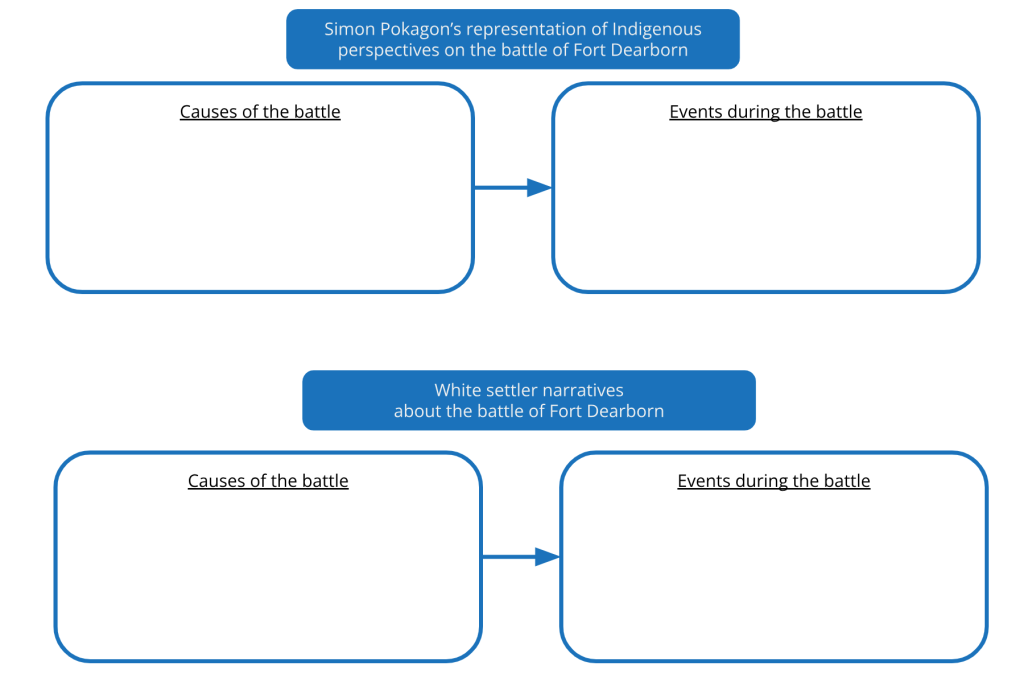 4. So much of history is about memory. In this exercise, we’re going to look at memories of the battle of Fort Dearborn in two places: in a Chicago city sculpture and in the recollections of Potawatomi leader Simon Pokagon. A graphic organizer can help you track the differences in their perspectives on this event. The following example is one option: