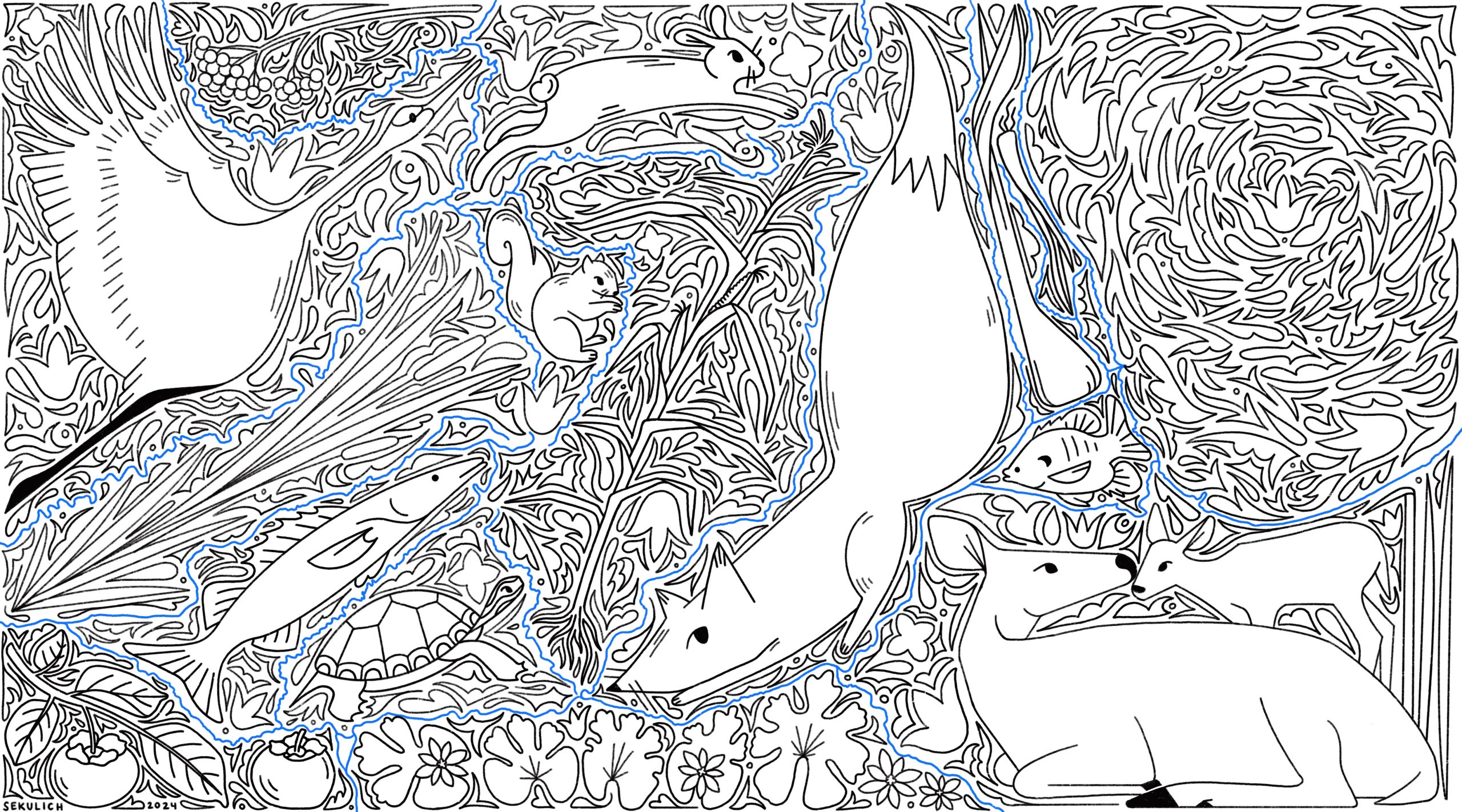 5. Myaamia artist Megan Sekulich created this image for the Indigenous Chicago story map. Megan writes, “The organic shapes seen throughout the piece, weaving and flowing around the rivers, plants, and animals, reference floral patterns seen in Great Lakes embroidery style Native beadwork.” She used the waterways of šikaakonki (Chicago) and northern Illinois as an outline, and she filled the space between each river with the plants and animals who call this place home, too. Many of these plants and animals are culturally significant to Myaamia people.