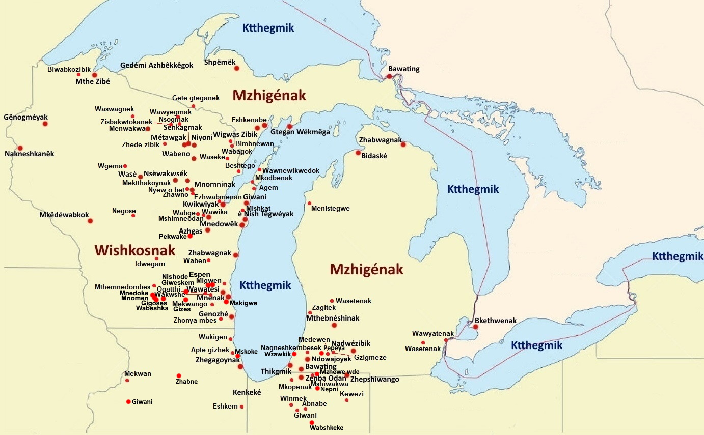 | Ojibweg, according to the Sault Ste. Marie Tribe of Chippewa Indians | “The Anishinaabeg (which can mean ‘Original People’ or ‘Spontaneous Beings’) have lived in the Great Lakes area for millenia. … Sault Tribe’s ancestors were Anishinaabeg fishing tribes whose settlements dotted the upper Great Lakes around Lake Superior, Lake Michigan and Lake Huron, throughout the St. Marys River system and the Straits of Mackinac.” |