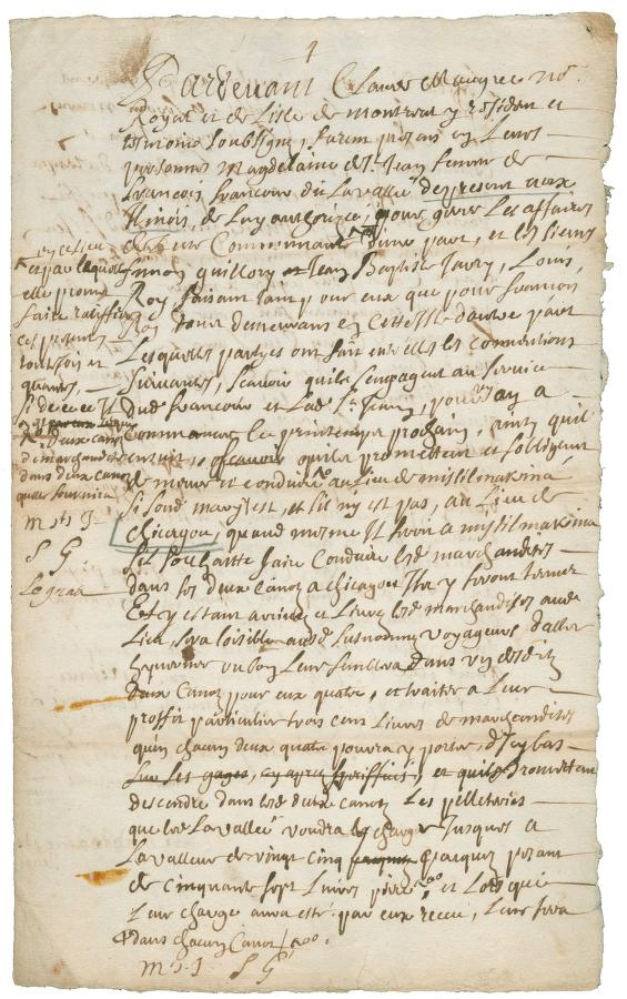 Native people throughout the Great Lakes and Inohkinki (the Illinois Country) also had established kinship networks and protocols for relationality, and they educated settlers on protocols for greetings, gift exchange, and communicating intentions. Much of this education was done by Native women who married non-Native fur traders. Through these marriages, non-Native settlers were incorporated into Native kinship networks, allowing them to safely travel and trade within these networks. But Native women were not passive participants in these arrangements. Many, like Marie Magdalaine St. Jean (Onandoga), who signed the contract above on behalf of her husband, were equal partners with their husbands in the fur trade business.