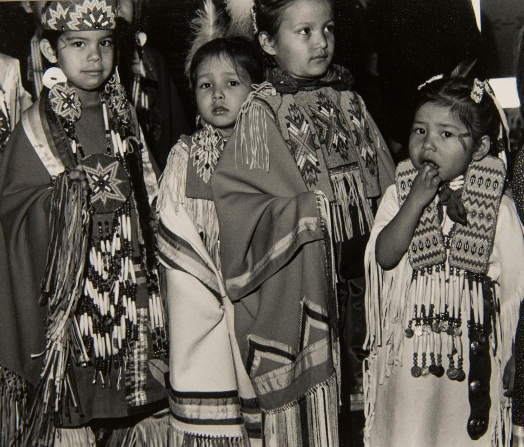 Michele Kline and the Hensley sisters line up for grand entry at the 1982 American Indian Center Annual Pow Wow. Seeing Indian in Chicago Exhibition Records, Newberry Library